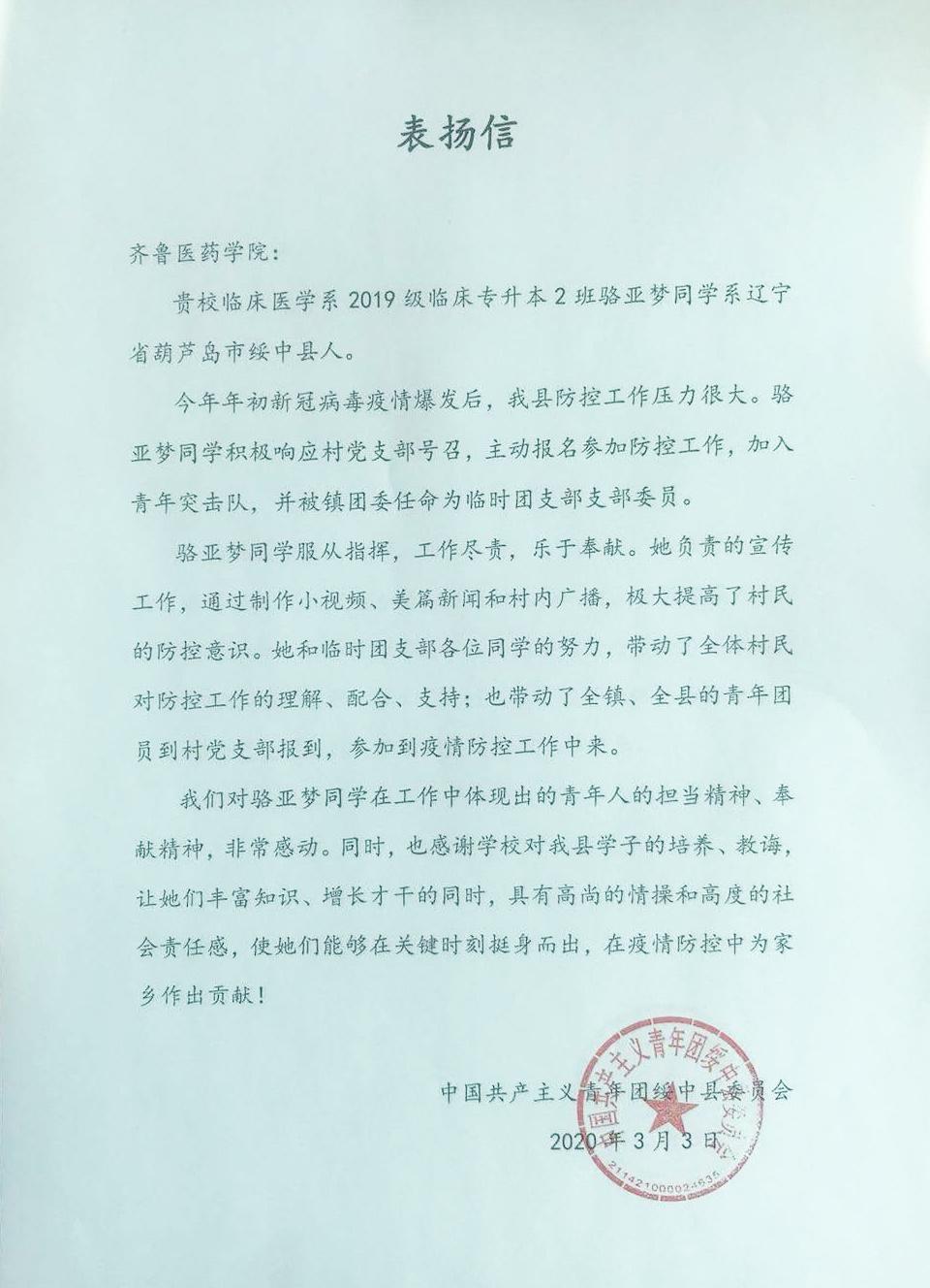 近日,齊魯醫(yī)藥學(xué)院臨床醫(yī)學(xué)院2019級(jí)臨床專升本2班駱亞夢(mèng)同學(xué)(遼寧省葫蘆島市綏中縣人),因在疫情防控工作中表現(xiàn)出色,受到了共青團(tuán)綏中縣委員會(huì)致信表?yè)P(yáng)。