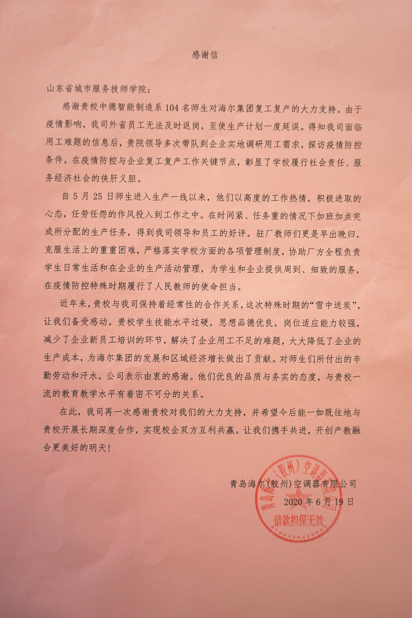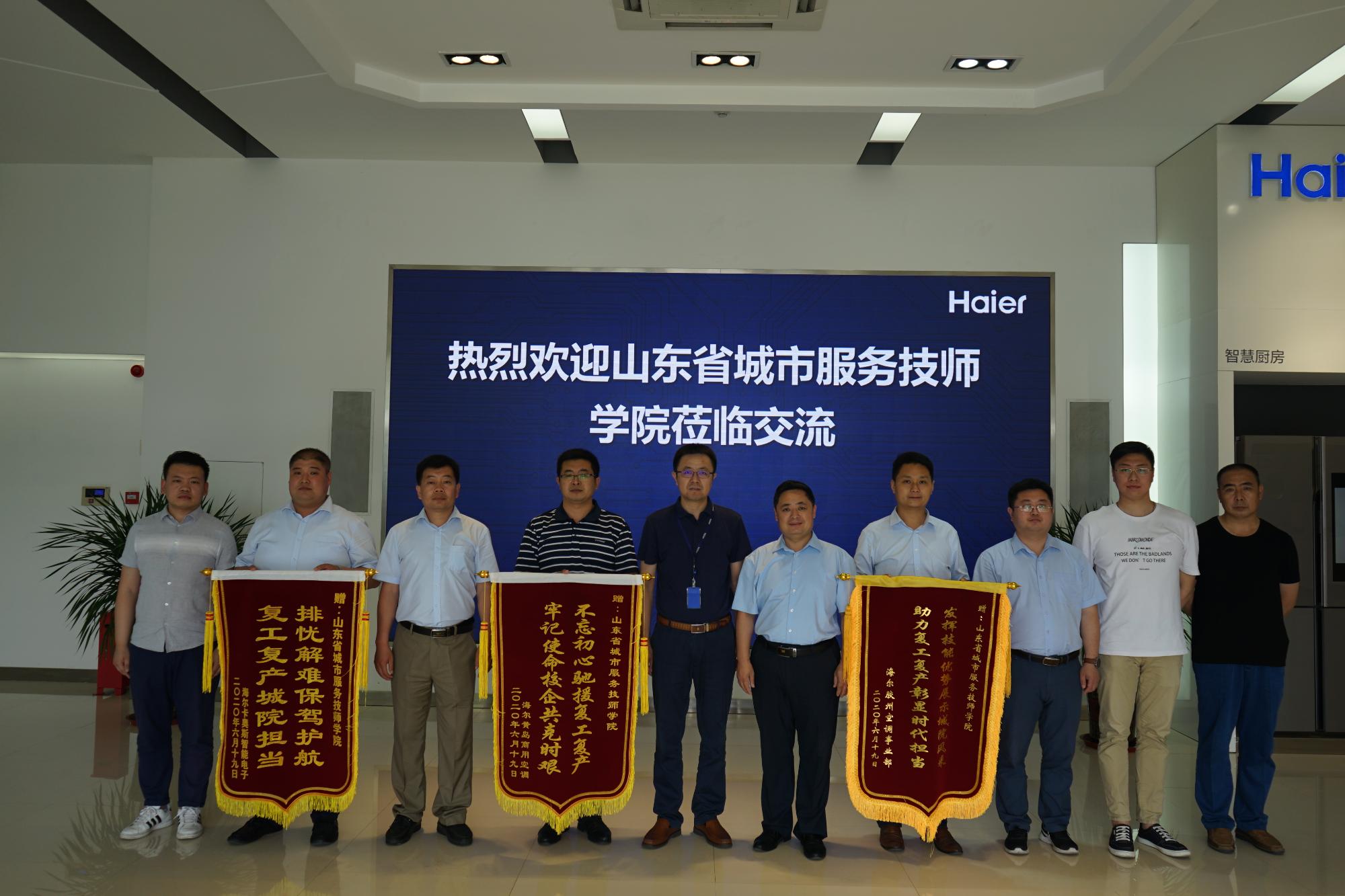 6月19日,學(xué)院黨委副書記刁洪斌帶隊(duì)赴青島海爾集團(tuán),看望慰問支援復(fù)工復(fù)產(chǎn)的一線師生。海爾集團(tuán)西北大區(qū)人力資源部部長汪濤、海爾集團(tuán)膠州空調(diào)廠區(qū)總經(jīng)理許磊以及海爾集團(tuán)卡奧斯智能電子有限公司總經(jīng)理高廣偉,代表企業(yè)對(duì)學(xué)院師生所展現(xiàn)的優(yōu)良思想品質(zhì)與務(wù)實(shí)工作作風(fēng)給予高度贊揚(yáng)。企業(yè)認(rèn)為,學(xué)院構(gòu)建的紅色思政教育、工匠精神與感恩教育“三位一體”立德樹人新模式,從精神和靈魂深處為培養(yǎng)“下得去、上手快、留得住、用得上”的技能人才奠定了思想文化基礎(chǔ),最大程度降低了學(xué)生流失率。尤其是在疫情防控的特殊時(shí)期,學(xué)院積極馳援,助力復(fù)工復(fù)產(chǎn),更是彰顯了省城市學(xué)院師生履行社會(huì)責(zé)任、服務(wù)經(jīng)濟(jì)社會(huì)的拳拳之心。他們希望深入推進(jìn)雙方合作的廣度和深度,在招工招生一體化、人才培養(yǎng)模式創(chuàng)新、企業(yè)教師工作站建設(shè)等方面,打造校企合作的“齊魯樣板”,希望在學(xué)院投資建設(shè)生產(chǎn)型實(shí)訓(xùn)中心和面向社會(huì)的職業(yè)技能培訓(xùn)基地,并向?qū)W院贈(zèng)送了錦旗和感謝信。
