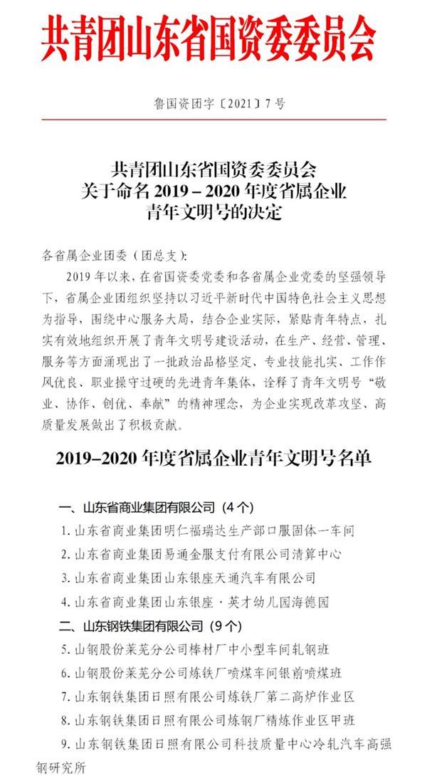 近日,共青團省國資委委員會公布了《關于命名2019-2020年省屬企業青年文明號的決定》,集團所屬的明仁福瑞達生產部口服固體一車間、易通金服支付有限公司清算中心、山東銀座天通汽車有限公司、山東銀座·英才幼兒園海德園榮獲“省屬企業青年文明號”榮譽稱號;銀座商城股份有限公司玉函分公司等9家單位均通過“省屬企業青年文明號”復查。