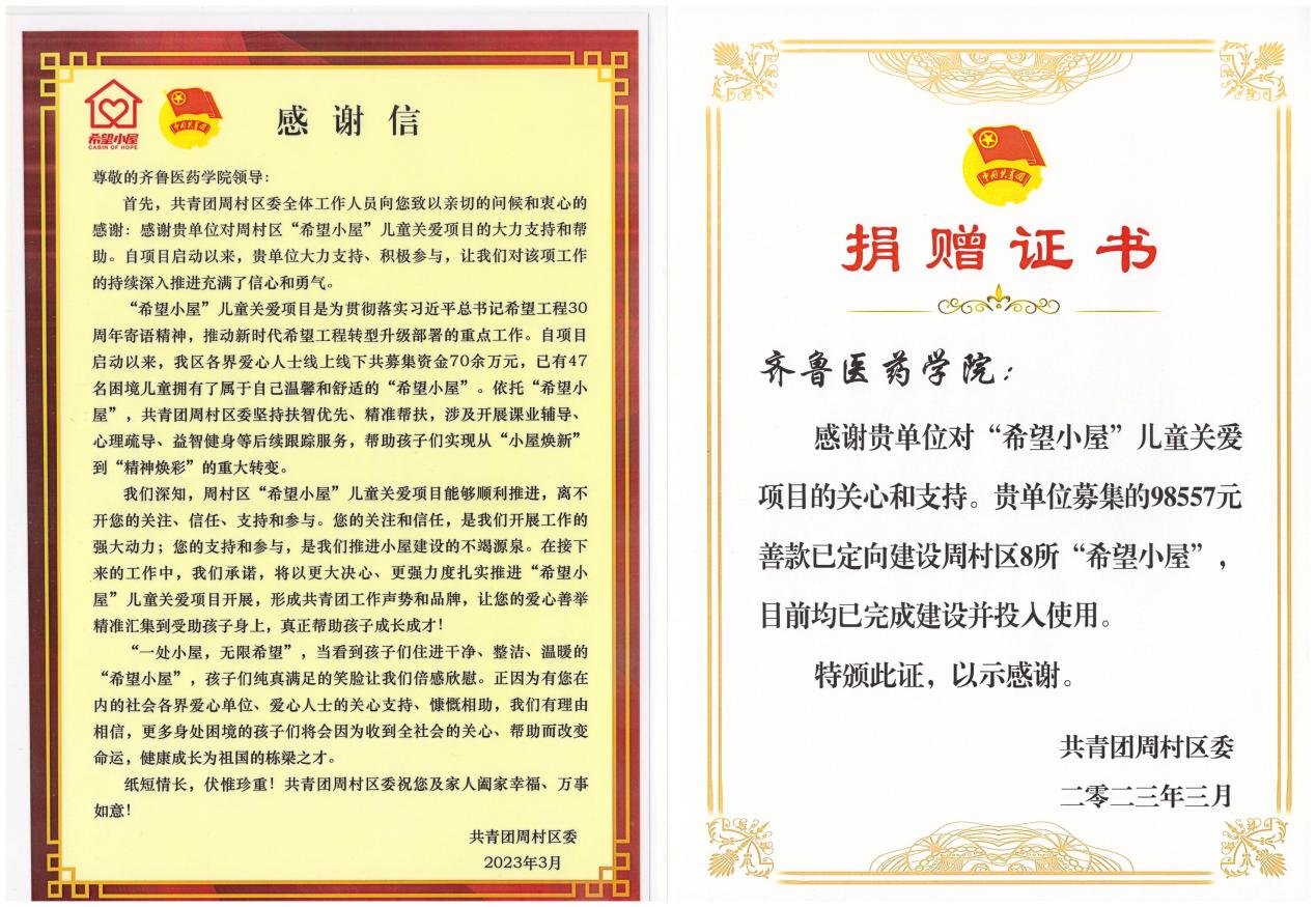 4月18日,齊魯醫(yī)藥學(xué)院收到共青團(tuán)周村區(qū)委發(fā)來(lái)的感謝信及捐贈(zèng)證書(shū),感謝學(xué)校對(duì)山東省“希望小屋”兒童關(guān)愛(ài)項(xiàng)目的積極參與與大力支持。