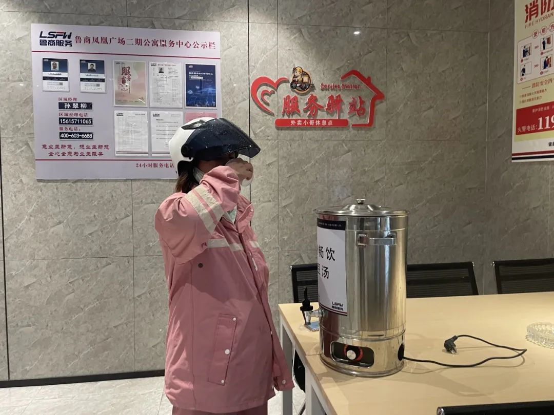 驛站為快遞小哥們準備了桌椅板凳、應急藥箱,同時準備了綠豆湯等免費飲品,能夠滿足快遞小哥們吃飯、交流和簡單的休息需求?!拔覀兿Mㄟ^驛站的建立,更廣泛、更直接、更有效的服務新就業形態勞動者,用實際行動踐行詮釋‘五心’服務理念。同時,也方便他們更好地服務我們的業主,實現善意的循環,共同營造溫馨、和諧的社區環境。”鳳凰廣場項目負責人表示。