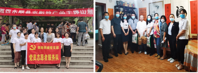 在社區舉辦的湘西扶貧農副產品展銷現場,銀座集團總部和商城店黨員志愿隊按照疫情防控要求,認真維持秩序,為社區群眾提供優質的服務,并將購買的農副產品作為慰問品送到社區困難黨員家中。
