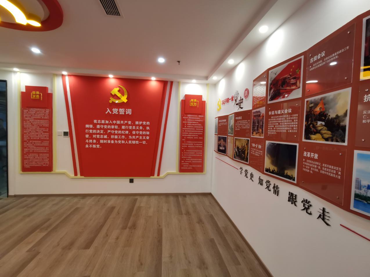 新建成的黨員活動中心集合了學習教育、宣傳展示、活動交流等功能。以莊嚴的黨徽為中心,四周環(huán)繞有黨旗、入黨誓詞、黨員的權(quán)利和義務、黨史、“廉政文化墻” “沂蒙精神”主題教育專欄及微書吧等。