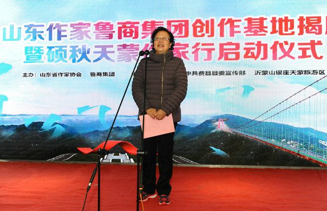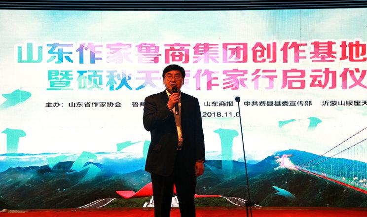 姬德君在致辭時(shí)表示,山東作家魯商集團(tuán)創(chuàng)作基地的所在地臨沂費(fèi)縣,地處沂蒙革命老區(qū),是中國地名文化遺產(chǎn)千年古縣、全國首批縣域“中國紅色地標(biāo)”。把作家創(chuàng)作基地建在這樣一片歷史文化悠久、革命傳統(tǒng)深厚的熱土上,一定能夠引導(dǎo)廣大作家進(jìn)一步樹立深入生活、扎根人民的創(chuàng)作理念,不斷創(chuàng)作推出更多更好展現(xiàn)山東氣派、齊魯風(fēng)格,為人民群眾喜聞樂見的文學(xué)精品佳作。省作家協(xié)會(huì)將以此次揭牌儀式和“碩秋天蒙作家行”采風(fēng)活動(dòng)為契機(jī),建設(shè)一支富有生機(jī)活力的文學(xué)隊(duì)伍,支持引導(dǎo)廣大作家走進(jìn)魯商、走進(jìn)費(fèi)縣,深入采訪采風(fēng),開展文學(xué)創(chuàng)作,努力多出精品、多出人才,為建設(shè)文學(xué)強(qiáng)省、勇攀文學(xué)高峰貢獻(xiàn)新的更大力量。