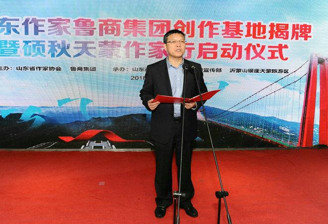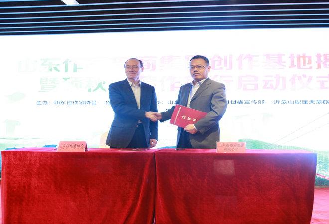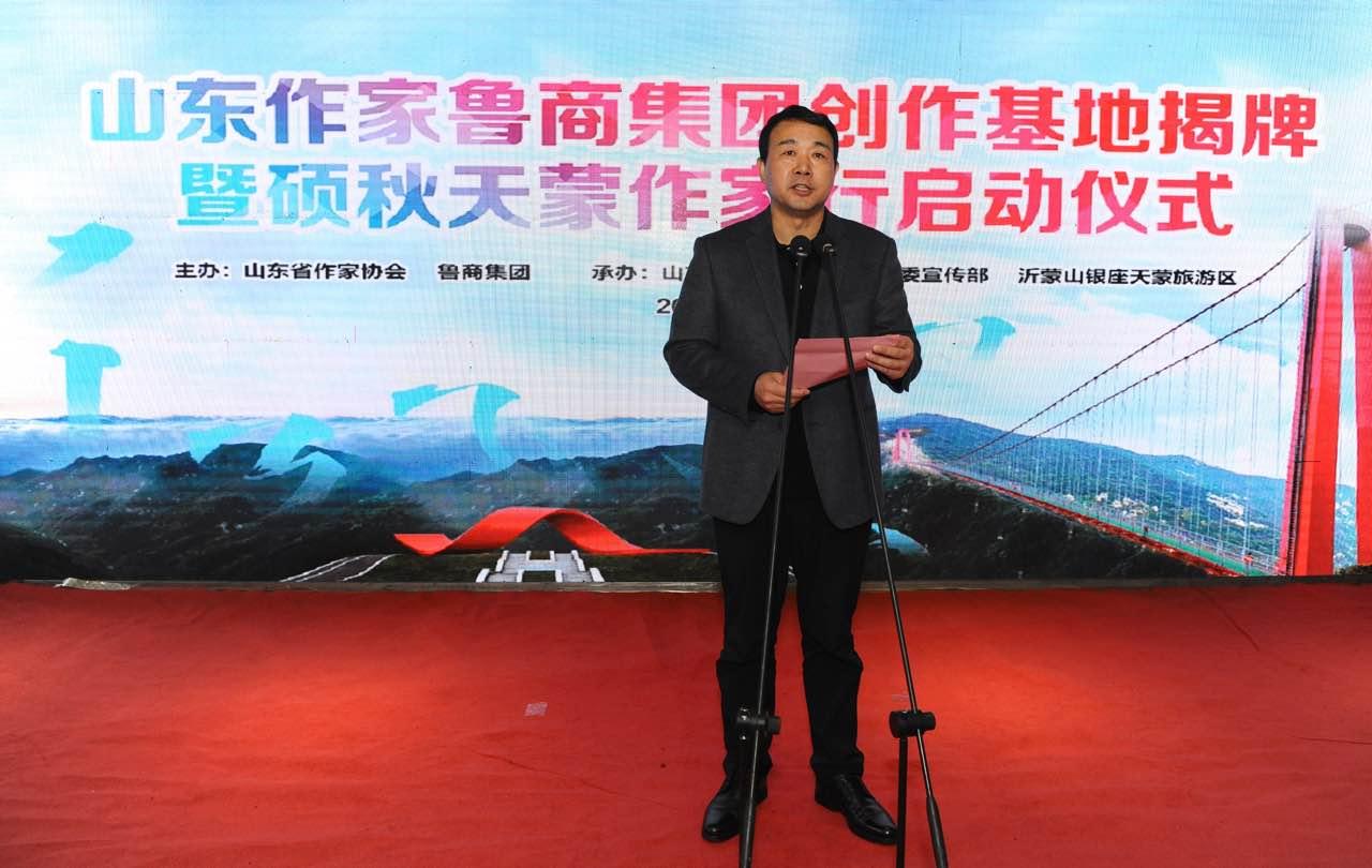 11月6日,由省作協(xié)、魯商集團(tuán)主辦,山東商報(bào)、中共費(fèi)縣縣委宣傳部、沂蒙山銀座天蒙旅游區(qū)承辦的山東作家魯商集團(tuán)創(chuàng)作基地揭牌暨碩秋天蒙作家行活動(dòng)正式啟動(dòng)。省委宣傳部常務(wù)副部長王紅勇,省作家協(xié)會(huì)黨組書記、副主席姬德君,魯商集團(tuán)黨委書記、董事長、中國作家協(xié)會(huì)會(huì)員、中國自然資源作協(xié)副主席高洪雷,臨沂市委常委、統(tǒng)戰(zhàn)部長邊峰等出席儀式。省作家協(xié)會(huì)黨組成員、副主席李軍和魯商集團(tuán)黨委副書記劉守亮,代表雙方簽署山東作家魯商集團(tuán)創(chuàng)作基地合作協(xié)議。