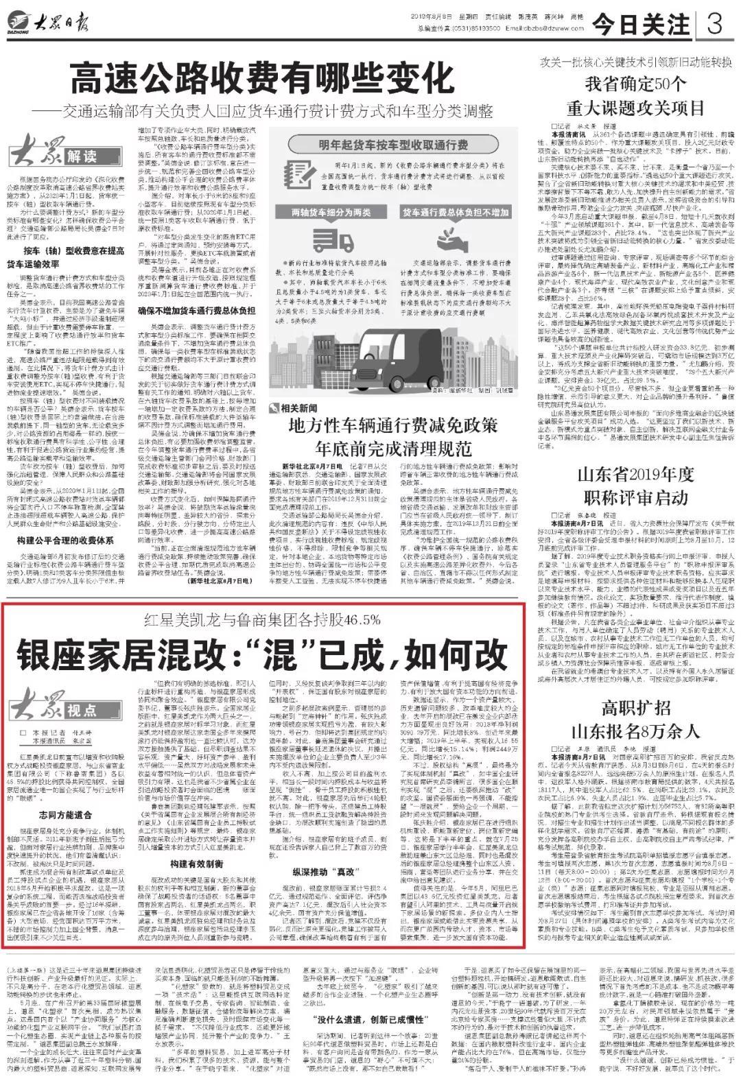(大眾日報 記者/付玉婷)紅星美凱龍日前宣布以增資和收購股權方式戰略投資銀座家居,與山東省商業集團有限公司(下稱魯商集團)各以46.5%的持股比例獲得共同控制權,全國家居流通業唯一的國企實現了與行業標桿的“聯姻”。