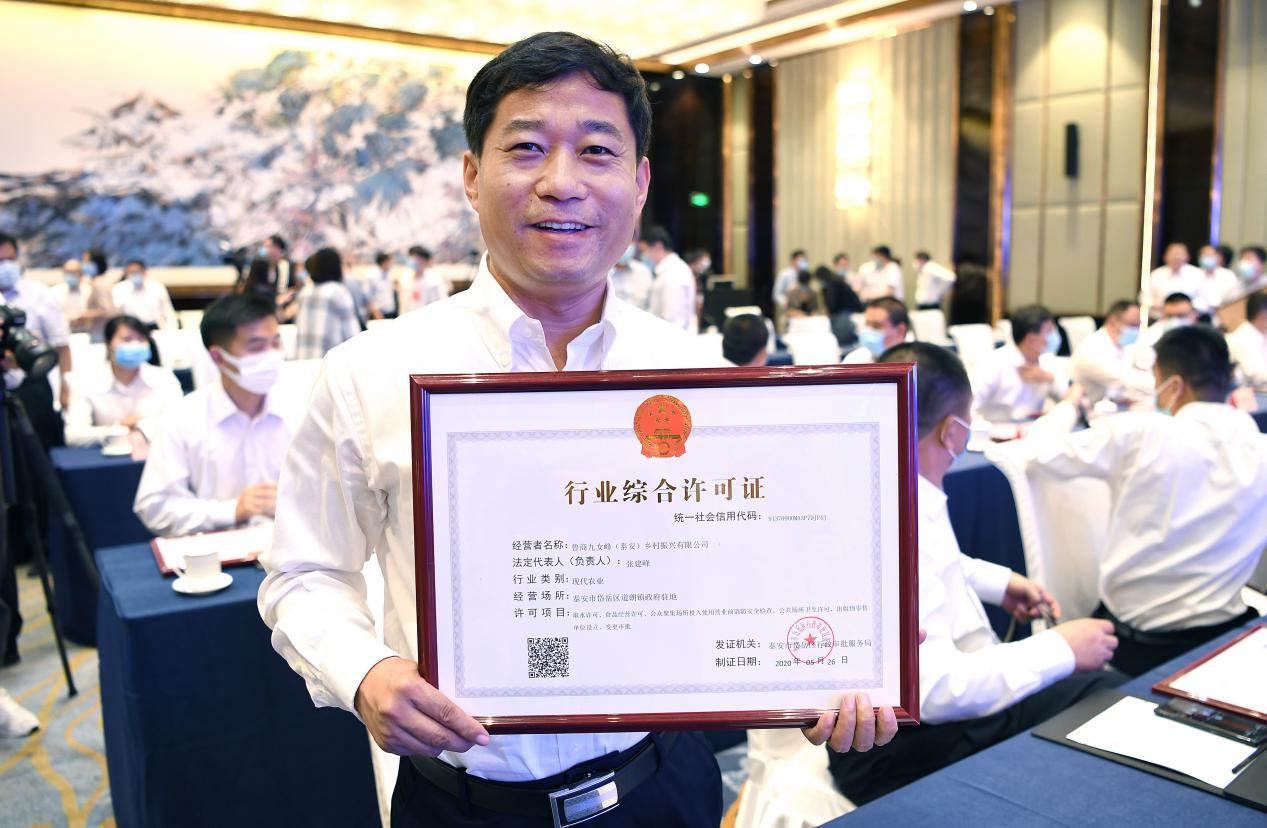 魯商九女峰(泰安)鄉村振興有限公司這份行業綜合許可證不僅是當日頒發的第一份證書,也是山東省頒發的第一份“現代農業”行業綜合許可證。該證將取水許可、食品經營許可、公共場所衛生許可、出版物零售單位設立變更審批、公眾聚集場所投入使用營業前消防安全檢查5張證書,合并為了1張,將極大地提高行政事項辦理效率,方便企業運營,助力高質量打造鄉村振興齊魯樣板。(文/圖 潘炳)