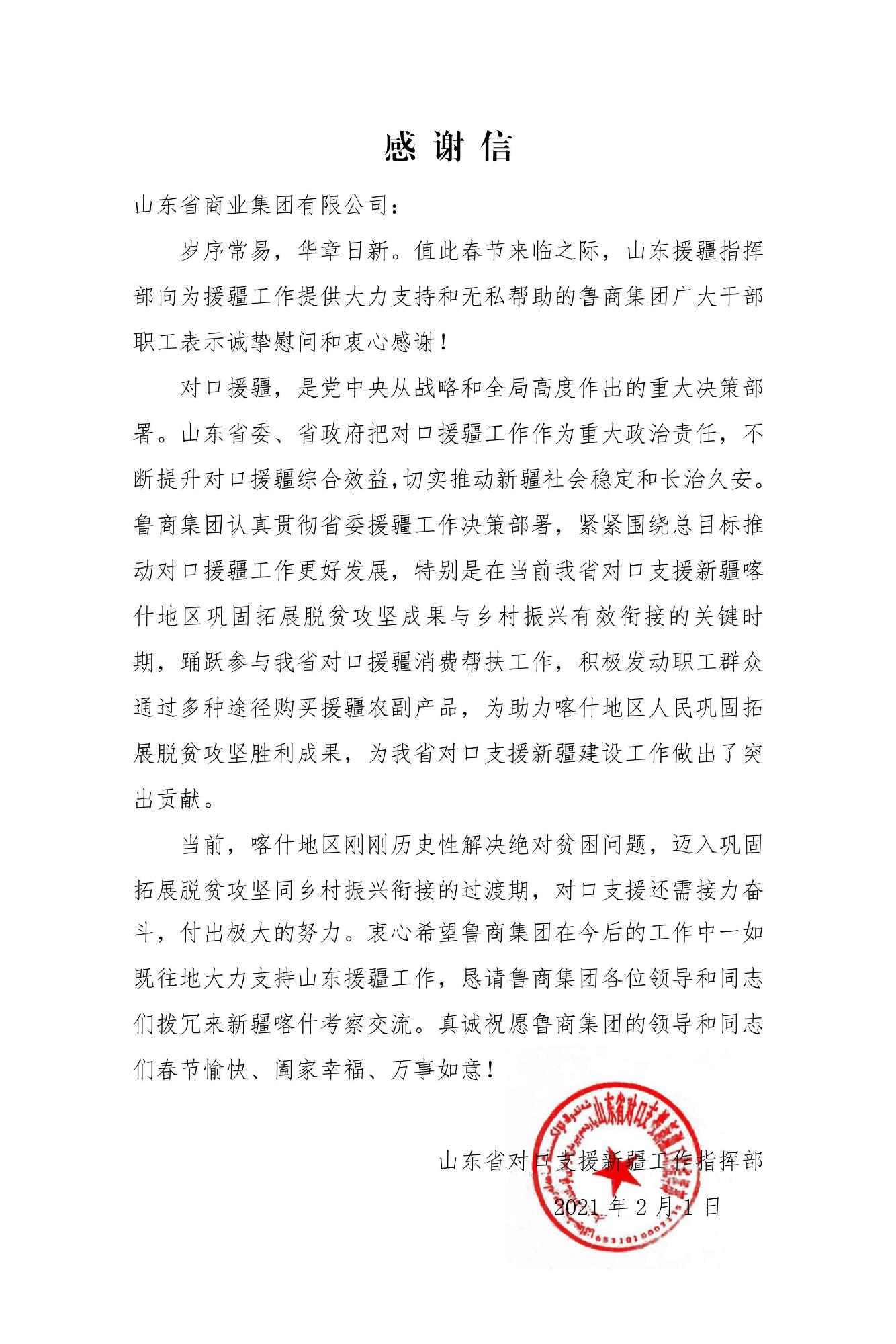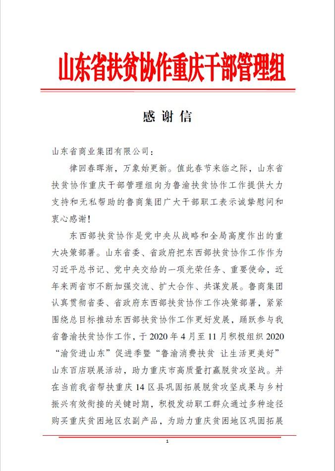 近日,魯商集團分別收到山東省對口支援新疆工作指揮部、山東省第九批援藏干部中心管理組、山東省扶貧協作重慶干部管理組發來的感謝信,對集團近年來在東西部扶貧協作以及對口支援工作中給予的支持和幫助表示感謝。