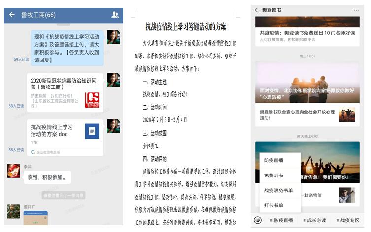 牧工商全體員工通過官方媒體、學習強國及集團發布的疫情相關信息等自行學習,積極關注“樊登讀書”微信公眾號“防疫直播”欄目,了解疫情動態和疫情防護知識等信息,并采取微信線上“新型冠狀病毒防治知識問答”答題、分享等方式,加強疫情防控知識學習。活動中,全體員工積極參與,學習答題熱情高漲,在提高自身疫情防護意識的同時,以實際行動正面宣傳,引導周圍群眾,體現國企擔當。在確保做好疫情防控工作的基礎上,提倡大家充分利用假期時間,多讀書多學習,提高知識水平,提升工作能力。