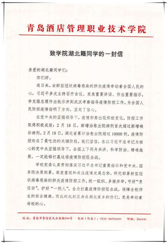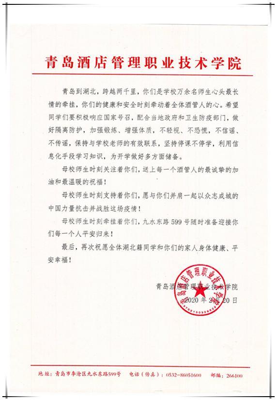 2月20日,青島酒店管理職業技術學院(簡稱青島酒店學院)特別發出了《致學院湖北籍同學的一封信》,為湖北籍學生送去學院的牽掛和全體師生的關心,希望同學們做好隔離防護,加強鍛煉、增強體質,不輕視、不恐慌,不信謠、不傳謠,保持與學校老師的有效聯系,利用信息化手段學習知識,為開學做好多方面儲備。