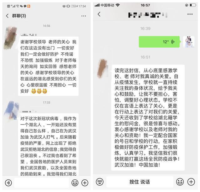 “大疫見真情,天寒暖人心。在這里我要感謝學院的各位老師,感謝對我的關心與支持!”學院2018級財務管理專業湖北籍張同學在給輔導員的留言中說。收到輔導員的信息和學校的慰問金,同學們或將慰問金補貼家用,或捐贈出去幫助他人,并紛紛留言表示感謝。他們說,在家會積極配合做好隔離工作,做好一個大學生的日常,不忘學習,為開學做準備,并力所能及地貢獻自己的力量,共克時艱。