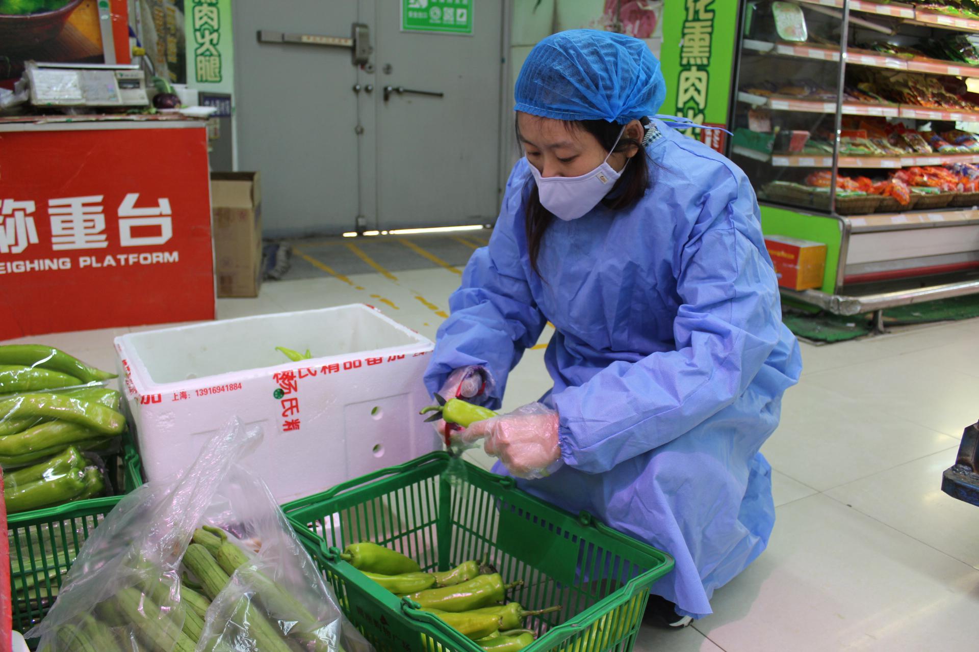 趙叢叢提前穿戴好防護(hù)服、手套等,武裝好自己。一天的工作就緊張而有序地開(kāi)始了:開(kāi)場(chǎng)前,她要帶領(lǐng)團(tuán)隊(duì)的同事,一起做好貨區(qū)消毒,蔬菜區(qū)50多個(gè)單品、堆架頭20多個(gè)單品的上架,線上平臺(tái)預(yù)訂單接收和備貨、集中配貨,處理線上顧客反映的問(wèn)題等各項(xiàng)工作。