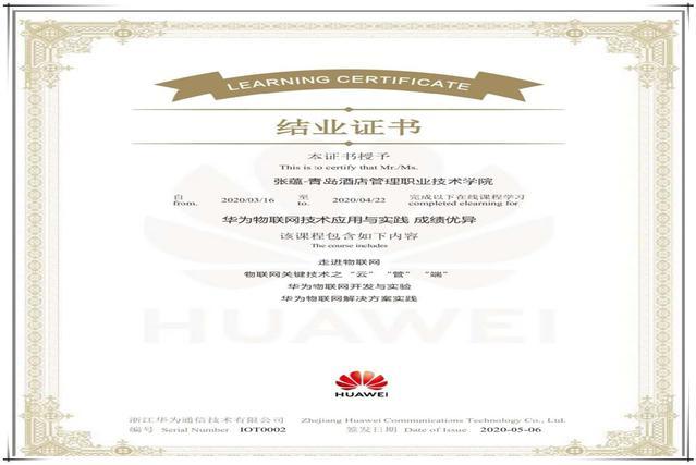 此次實訓,華為公司為學院物聯網學子開設網絡平臺專區,課程基于華為“Ocean Connect” 平臺深入剖析了物聯網技術的最新應用場景,給學生提供了在線實訓的良機。學院組織了2018級物聯網應用技術專業學生及2019級計算機應用專業群的優秀學生共計100人參加。經過考核,97人通過所有測試,拿到了華為“物聯網技術應用與實踐”課程認證證書,其中優秀率達45%。