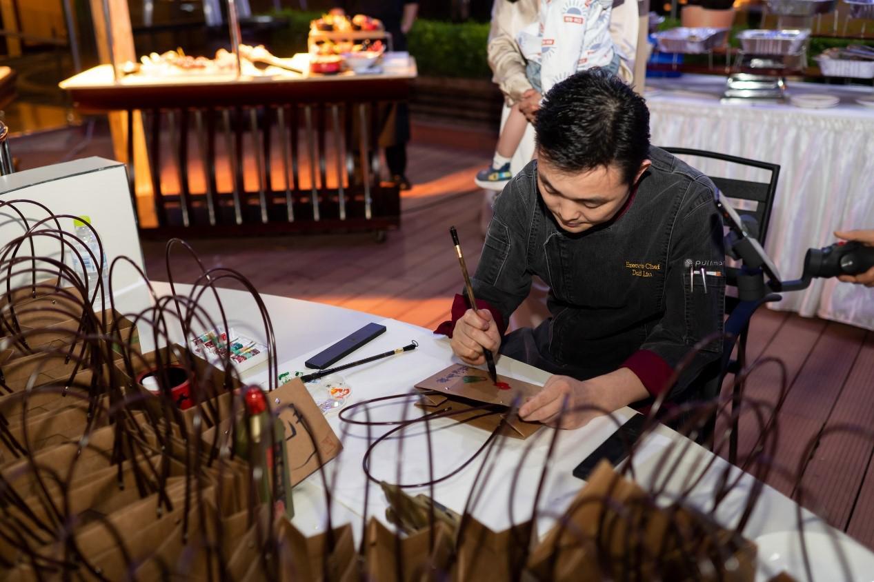 “大家好,此次作品為三份手寫菜單,5.21元起拍,競拍開始!”臨沂魯商鉑爾曼行政總廚劉國安將書法與菜單相結(jié)合,富有藝術(shù)氣息。現(xiàn)場以及手機(jī)端的粉絲興趣濃厚,紛紛舉牌,最終三款產(chǎn)品以556元成交。隨后,劉廚變身畫師,在手提袋上畫滿了寓意美好的白菜、櫻桃等,客人購買后可將手提袋裝滿粽子并帶走,現(xiàn)場收入近2000元。