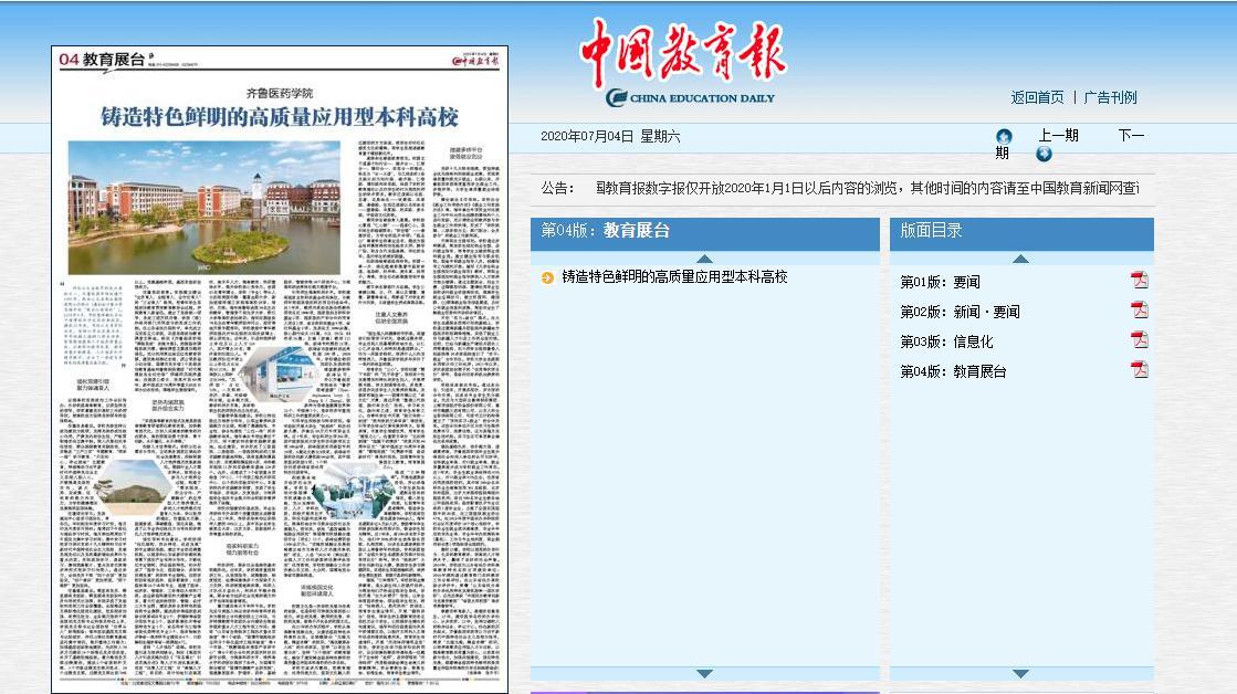 7月4日,《中國(guó)教育報(bào)》第4版以《齊魯醫(yī)藥學(xué)院:鑄造特色鮮明的高質(zhì)量應(yīng)用型本科高校》為題,整版報(bào)道學(xué)院辦學(xué)情況。