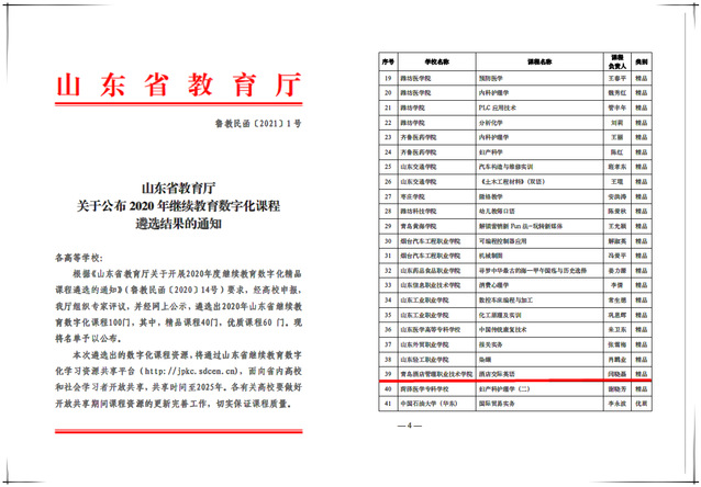 1月10日,省教育廳下發《關于公布2020年繼續教育數字化課程遴選結果的通知》(魯教民函﹝2021﹞1號),青島酒店學院3門課程入選山東省2020年度繼續教育數字化課程。