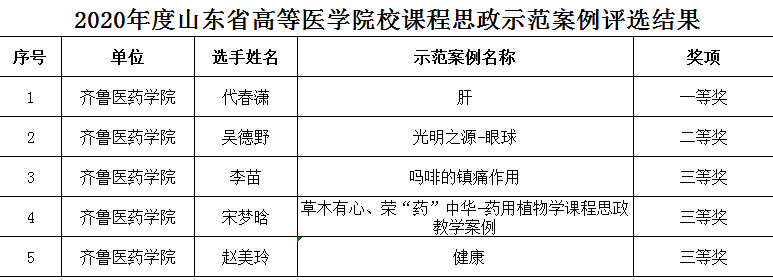 2月1日,根據(jù)山東省高等醫(yī)學(xué)教育研究中心《關(guān)于公布2020年度山東省高等醫(yī)學(xué)院校課程思政示范案例評選結(jié)果的通知》,齊魯醫(yī)藥學(xué)院申報的5項案例均獲得獎項,其中一等獎1項,二等獎1項,三等獎3項。