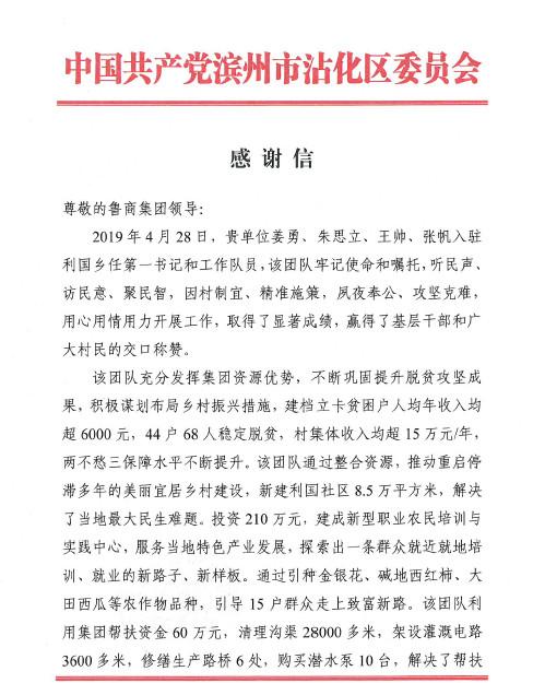 近日,集團(tuán)收到濱州市沾化區(qū)委區(qū)政府發(fā)來的感謝信,感謝集團(tuán)選派的“第一書記”兩年來扎根一線、攻堅(jiān)克難,幫助和支持沾化經(jīng)濟(jì)和社會發(fā)展作出的實(shí)績和貢獻(xiàn)。