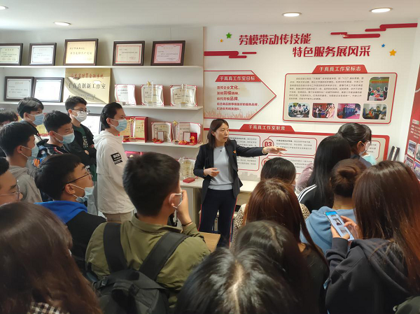 在銀座商城“于真真創(chuàng)新工作室”,速打領(lǐng)帶世界吉尼斯紀(jì)錄保持者、全國(guó)勞模、山東省富民興魯勞動(dòng)獎(jiǎng)?wù)芦@得者于真真與同學(xué)們親切交流,并現(xiàn)場(chǎng)展示了速打領(lǐng)帶技能。同學(xué)們被她精益求精、勇攀高峰的事跡所震撼,決心在勞動(dòng)實(shí)踐基地潛心錘煉技能,做齊魯新工匠。