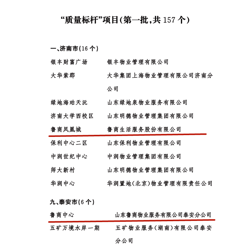 4月19日,山東省住房和城鄉建設廳(以下簡稱省住建廳)發布有關通知,公布品牌建設典型示范案例和“質量標桿”項目(第一批),魯商服務在管的魯商鳳凰城和泰安魯商中心兩項目被評為“質量標桿”項目。