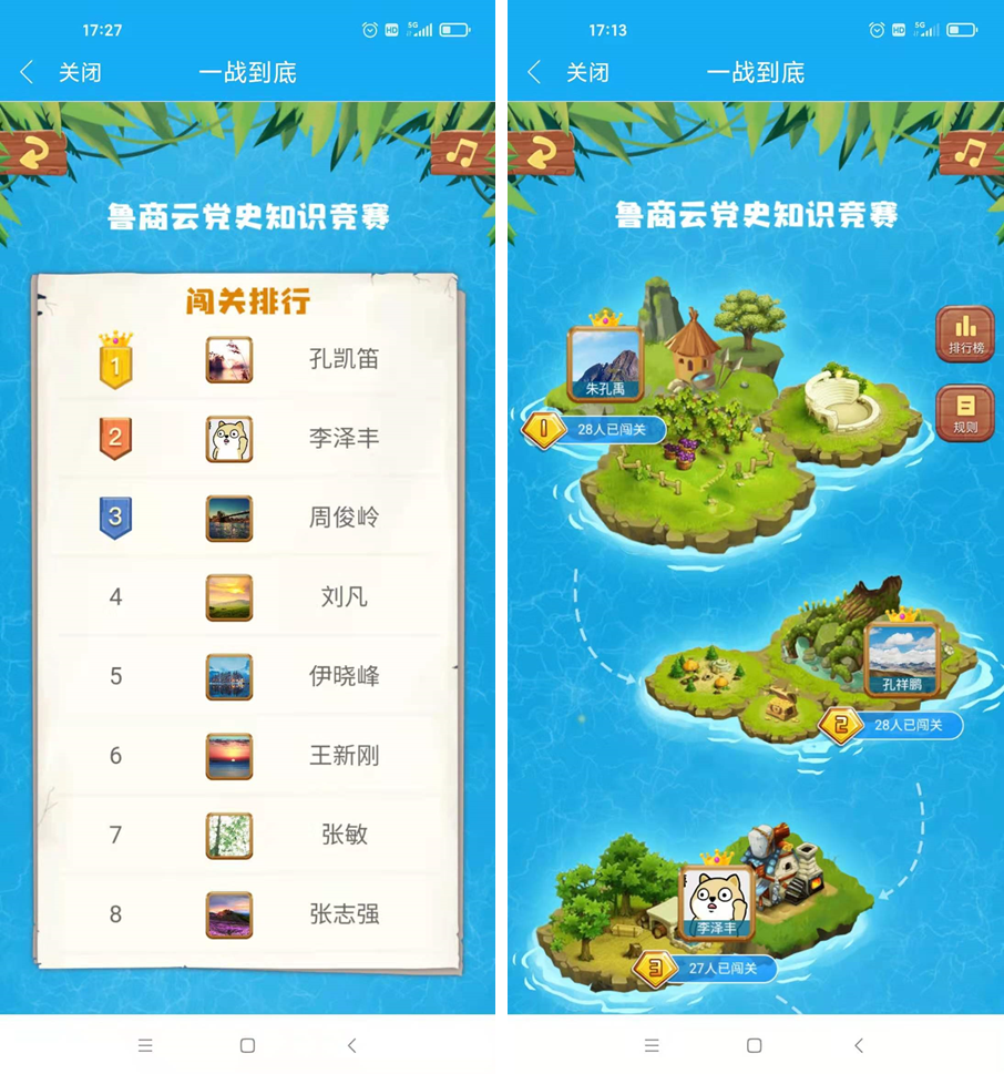 此次黨史知識(shí)競(jìng)賽是中心黨史學(xué)習(xí)教育“七個(gè)一”系列活動(dòng)的“共賽一次黨史”模塊,競(jìng)賽充分利用集團(tuán)在線學(xué)習(xí)平臺(tái)的強(qiáng)大功能,采用游戲化闖關(guān)模式開(kāi)展,根據(jù)答題難易程度,全程共設(shè)置十個(gè)關(guān)卡,系統(tǒng)按照闖關(guān)數(shù)量、速度、正確率自動(dòng)實(shí)時(shí)排名。中心全體員工通過(guò)手機(jī)在線參與競(jìng)賽活動(dòng),過(guò)五關(guān)、斬六將,最后李澤豐、孔凱笛、周峻嶺獲得競(jìng)賽前三名并贏得書(shū)券獎(jiǎng)勵(lì)。