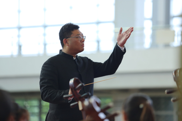 音樂會在民族管弦樂合奏《北京喜訊到邊寨》中拉開序幕。演奏家們演奏了《瑤族舞曲》《二泉映月》《賽馬》等大眾耳熟能詳?shù)拿褡逍桑瑤砹藲g快悠揚、熱烈活潑的嗩吶對奏《正月十五鬧雪燈》等精彩曲目。音樂會中不僅有傳統(tǒng)的民樂演奏,還融入了歌手及新民樂的演出形式,側(cè)重觀賞性、普及性與藝術(shù)性。其中,現(xiàn)代新民樂《十面埋伏》《彝族舞曲》,讓在座師生對不同民族音樂的魅力有了全新的感受;《南湖的船,黨的搖籃》《不忘初心》用民族的聲音唱響黨的百年歷史,謳歌黨的豐功偉績,將音樂會推上了高潮。音樂會尾聲,一曲《我的祖國》音韻裊裊、蕩氣回腸,表達了對祖國最深沉的愛與祝福。在熱烈的掌聲和歡呼聲中,本場民族音樂會圓滿落幕。演出過程中,樂團相關(guān)負(fù)責(zé)人現(xiàn)場介紹樂器、講解曲目,面向師生普及了民族音樂知識。