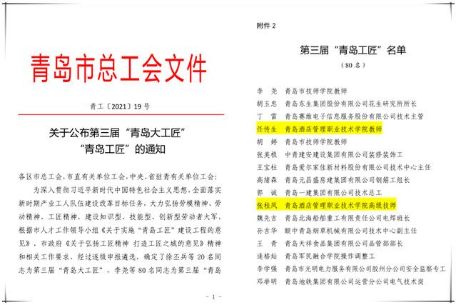 近日,青島市總工會下發(fā)《關(guān)于公布第三屆“青島大工匠”“青島工匠”的通知》,青島酒店學(xué)院烹飪學(xué)院張桂鳳、任傳生兩名教師獲評“青島工匠”。