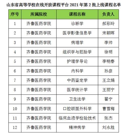 近日,省高等學(xué)校課程聯(lián)盟公布《山東省高等學(xué)校在線開放課程平臺2021年第2批上線課程名單》,齊魯醫(yī)藥學(xué)院12門課程獲批上線。