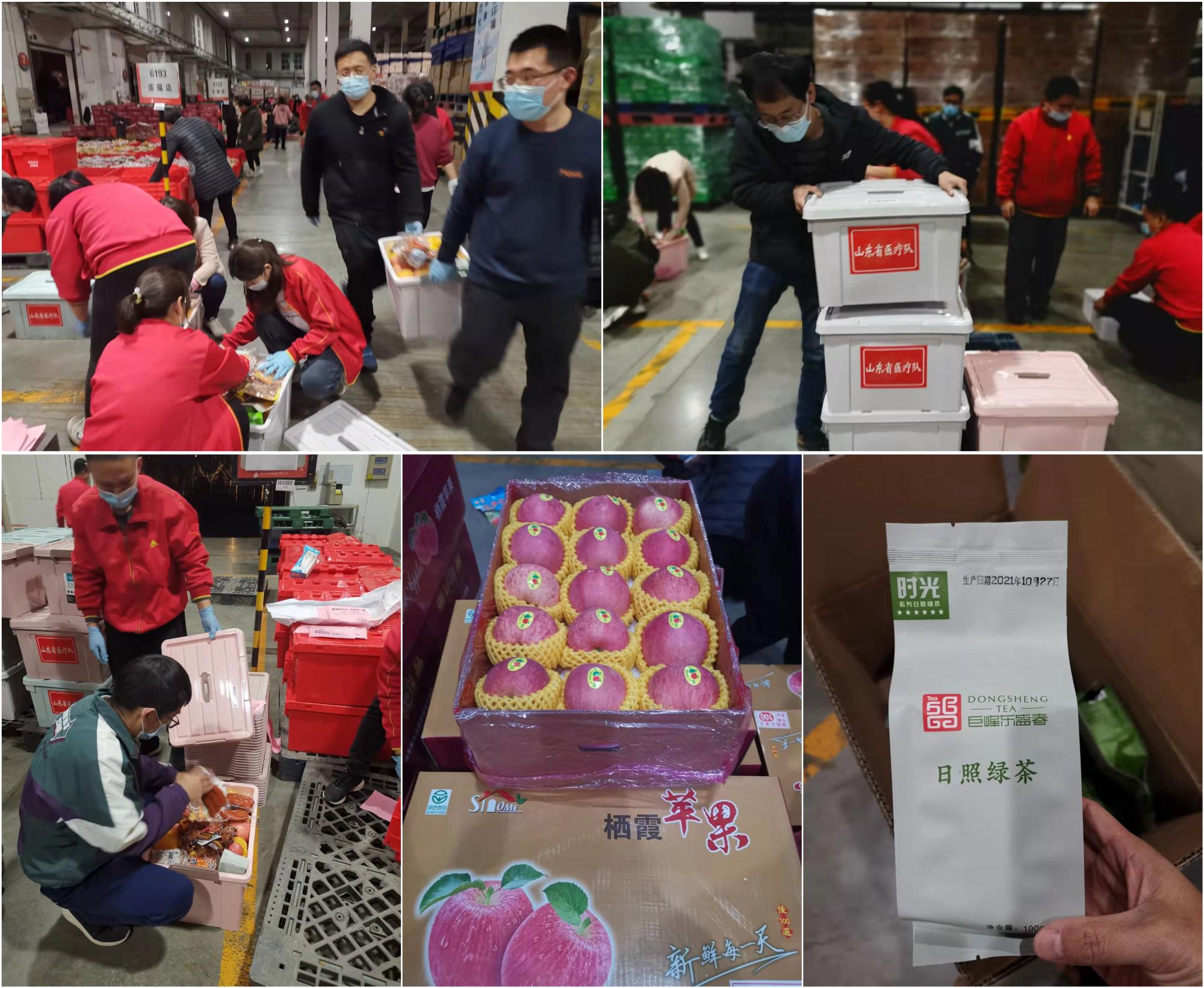 為豐富醫療隊員的物資供給,超市事業部聯合銀座廣場店緊急統籌貨源,精心選品10余種,包含方便面、自熱米飯、肉蛋腸菜、牛奶、巧克力以及帶有濃濃家鄉味的紅富士蘋果和日照綠茶。4月4日晚,銀座配送中心緊急調度百余人通宵奮戰,圓滿完成1200份物資的分裝。4月5日清晨,配合省交通運輸廳安排的專車將生活物資包運往上海。
