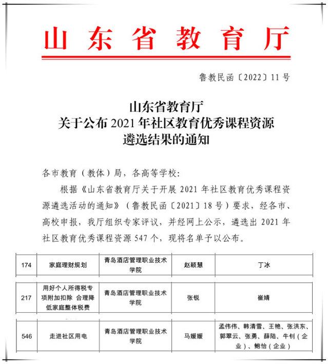 近日,省教育廳公布2021年社區教育優秀課程資源遴選結果,青島酒店學院《家庭理財規劃》《用好個人所得稅專項附加扣除合理降低家庭整體稅費》《走進社區用電》3門課程被評為優秀課程。