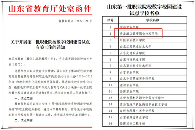 近日,省教育廳發布通知,青島酒店學院入選第一批職業院校數字校園建設試點單位。