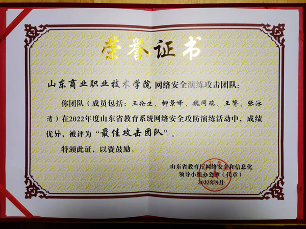 9月6日,由省委網(wǎng)信辦和省教育廳主辦的2022年國家網(wǎng)絡(luò)安全宣傳周山東省校園日活動啟動儀式暨山東省教育網(wǎng)絡(luò)安全創(chuàng)新發(fā)展論壇在青島市舉辦。省委網(wǎng)信辦副主任趙樹嶺,省委教育工委副書記、省教育廳黨組副書記、副廳長白皓出席活動并講話。山東商院作為2022年度山東省教育系統(tǒng)網(wǎng)絡(luò)安全攻防演練活動“最佳攻擊團(tuán)隊(duì)”獲得者在活動上受到表彰,這也是山東商院第3次獲此殊榮。