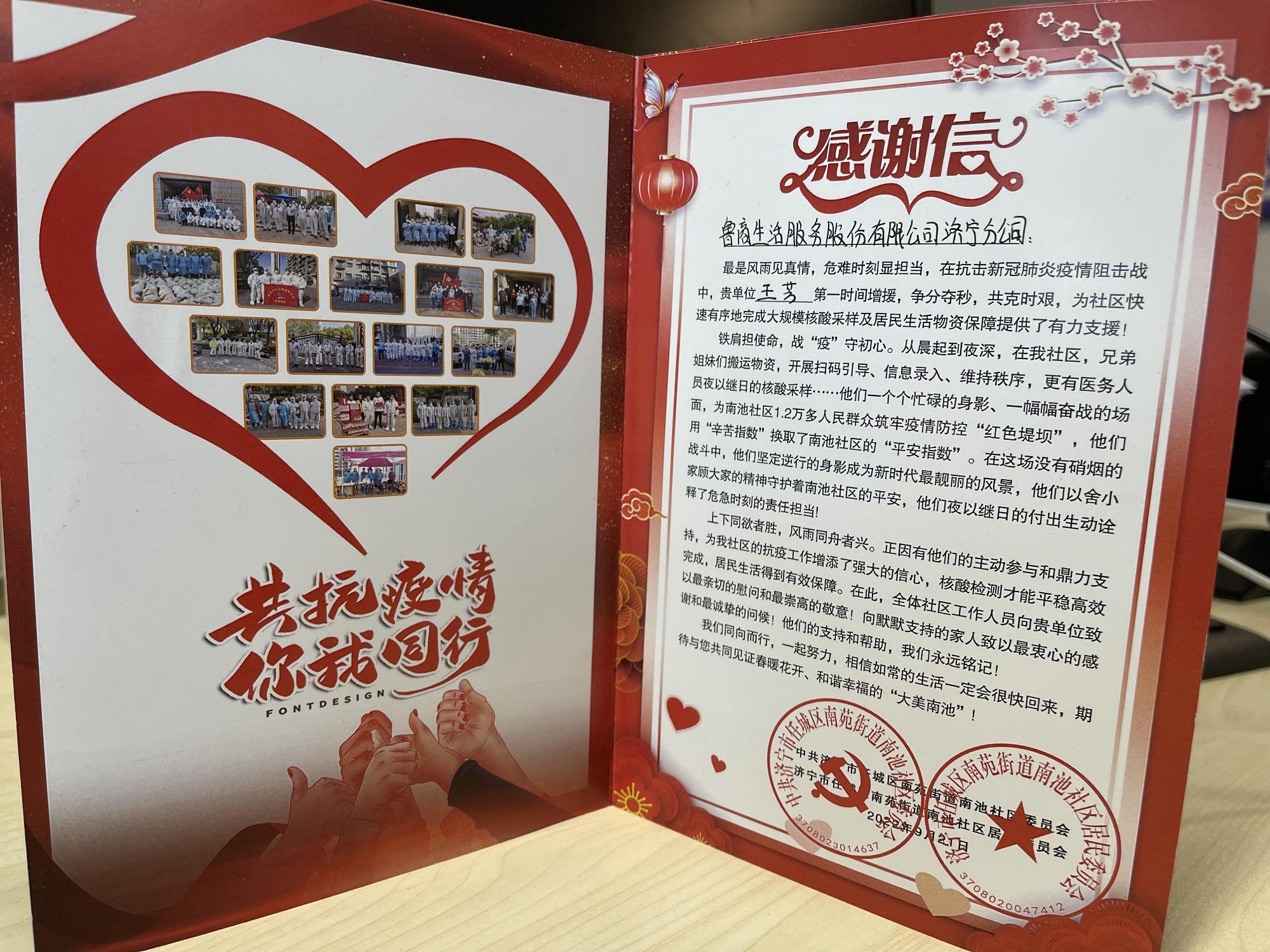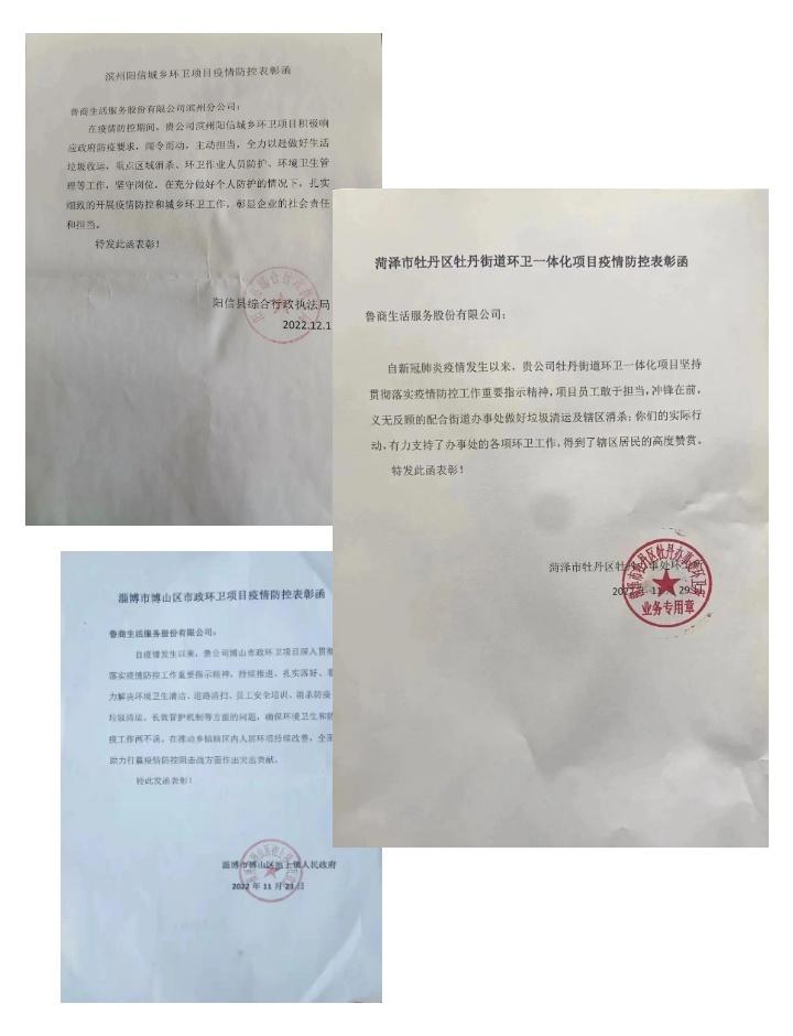 類似的事情,近期在魯商服務(wù)各項(xiàng)目時(shí)有發(fā)生。北京藍(lán)岸麗舍項(xiàng)目服務(wù)中心陸續(xù)收到當(dāng)?shù)亟值擂k及社區(qū)業(yè)主送來的感謝信,對(duì)項(xiàng)目在應(yīng)對(duì)疫情時(shí)作出的迅速反應(yīng)和有效措施予以感謝和表揚(yáng)。淄博博山城鄉(xiāng)環(huán)衛(wèi)一體化項(xiàng)目服務(wù)中心所服務(wù)的池上鎮(zhèn)、源泉鎮(zhèn)也發(fā)來表彰函,對(duì)項(xiàng)目在疫情防控工作中的突出表現(xiàn)給予表彰。