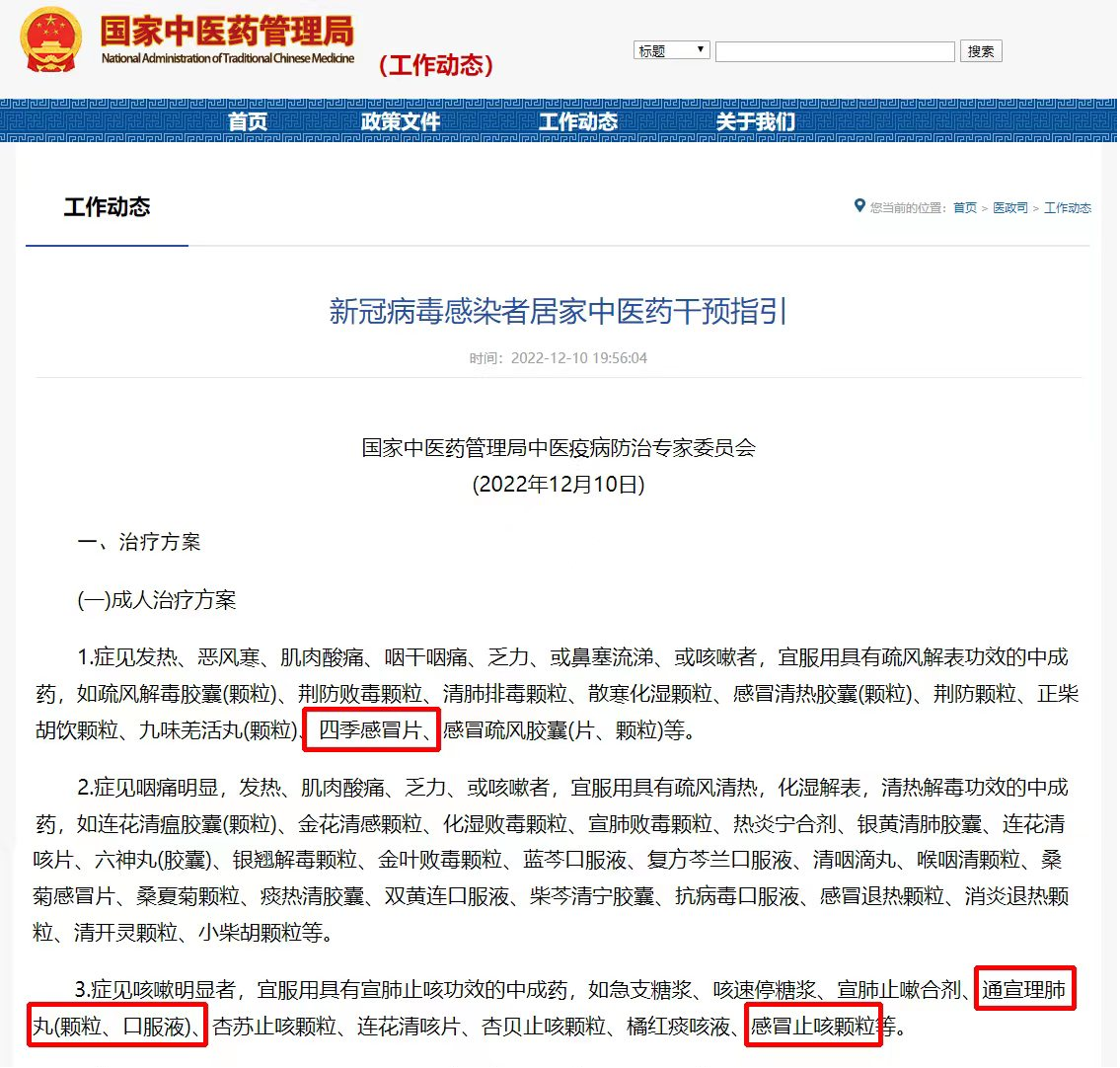 2022年12月10日,國家中醫藥管理局中醫疫病防治專家委員會權威發布新冠病毒感染者居家中醫藥干預指引。成人治療方案中推薦四季感冒片用于發熱、惡風寒、肌肉酸痛、咽干咽痛、乏力、或鼻塞流涕、或咳嗽的新冠病毒感染者;推薦通宣理肺丸(顆粒、口服液)和感冒止咳顆粒用于咳嗽明顯的新冠病毒感染者。