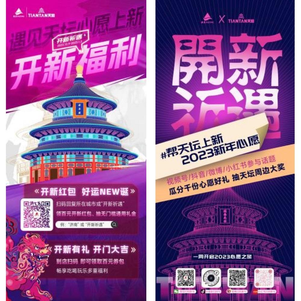 在本次跨年季,銀座集團(tuán)圍繞年終消費(fèi)場(chǎng)景核心需求,通過情感營(yíng)銷主導(dǎo)突圍年終營(yíng)銷,借勢(shì)IP內(nèi)核打造差異化療愈體驗(yàn)。線下打造具有網(wǎng)紅屬性的創(chuàng)意天壇系列裝置,讓消費(fèi)者沉浸式游逛;線上參與話題“#幫天壇上新2023新年心愿”可瓜分千份心愿好禮,助力心愿達(dá)成。12月31日,25城共同打造萬人冬祈盛典跨年派對(duì),為城市送上溫暖的祝福,一同許下2023美好心愿。