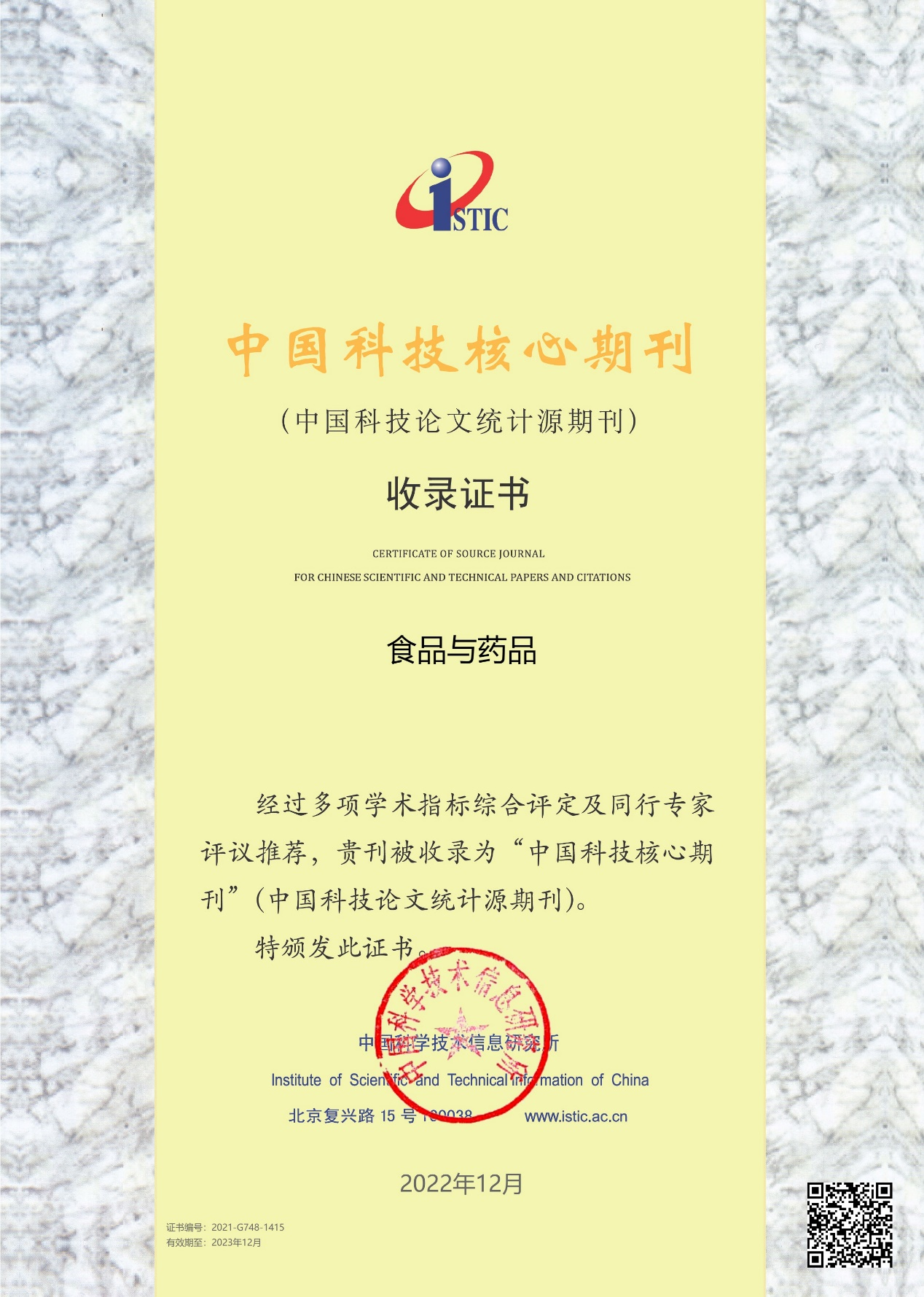 近日,2022年中國科技核心期刊(中國科技論文統計源期刊,CSTPCD)目錄發布,由山東省商業集團有限公司主管和山東省藥學科學院主辦的《食品與藥品》實現連續多年入選此目錄。