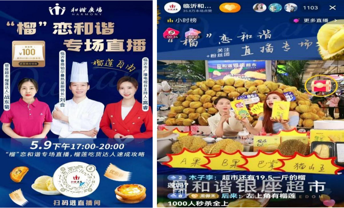 4月29日至5月3日,臨沂和諧店超市煥新開業(yè)之際,借助公司統(tǒng)一訂購泰國金枕榴蓮的價格優(yōu)勢,門店進行大堆頭陳列,提前兩天在抖音進行預售團購,銷售團券近80萬元。