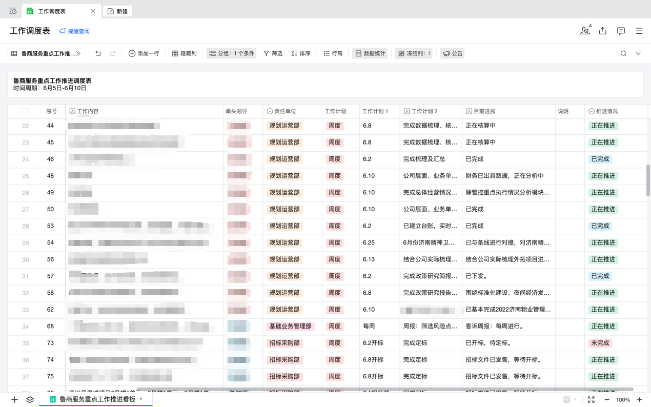 公司通過“企業(yè)微信智能圖表”,創(chuàng)建《調(diào)度事項視圖看板》,形成“實時督導(dǎo)”,隨時查看工作進度,實時調(diào)度工作協(xié)同,工作完成及時銷項,實現(xiàn)常態(tài)調(diào)度、專項調(diào)度高效結(jié)合,確保工作責(zé)任明晰、節(jié)點明確、推進有力、見行見效。截至5月底,梳理重點、難點工作事項臺賬122項,公司周調(diào)度事項銷項率達100%,月銷項率達92%。