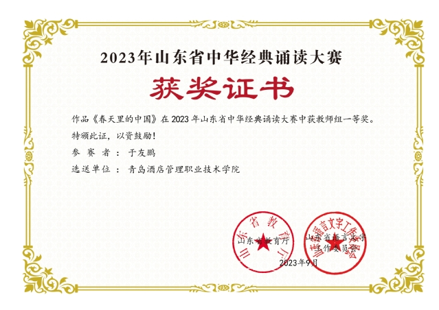 近日,由山東省教育廳、山東省語(yǔ)言文字工作委員會(huì)主辦的2023年山東省中華經(jīng)典誦讀大賽評(píng)選結(jié)果揭曉,青島酒店管理職院基礎(chǔ)教學(xué)部教師于友鵬的作品《春天里的中國(guó)》獲得“教師組”一等獎(jiǎng)。