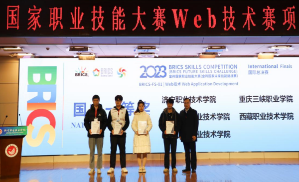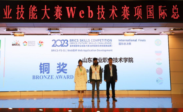 12月1日至3日,2023金磚國(guó)家職業(yè)技能大賽Web技術(shù)賽項(xiàng)國(guó)際總決賽舉行,來自金磚五國(guó)及孟加拉國(guó)、巴基斯坦等10國(guó)的線上線下共309支參賽隊(duì)伍參加此次比賽。經(jīng)過激烈角逐,山東商職學(xué)院云計(jì)算技術(shù)與應(yīng)用產(chǎn)業(yè)學(xué)院學(xué)生張可欣獲總決賽國(guó)內(nèi)一等獎(jiǎng),指導(dǎo)老師薛現(xiàn)偉獲優(yōu)秀指導(dǎo)專家獎(jiǎng),山東商職學(xué)院獲參賽國(guó)銅獎(jiǎng)。
