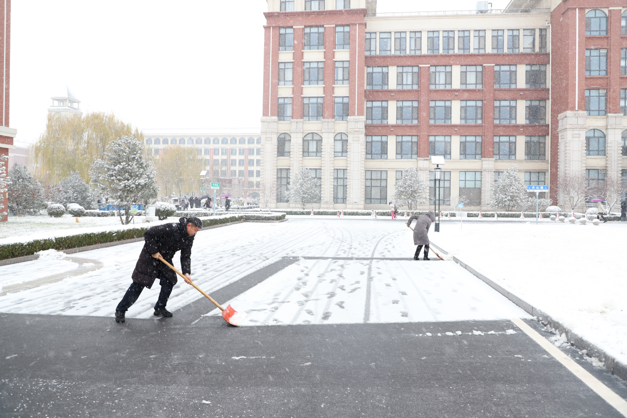 齊魯醫藥學院后勤服務人員提早到位、堅守崗位,按照事先劃分責任區域,進行人工鏟雪除雪作業,黨員干部沖鋒在前,壓緊壓實工作責任,在上課前完成主要道路清掃工作,全力保障師生出行通暢。