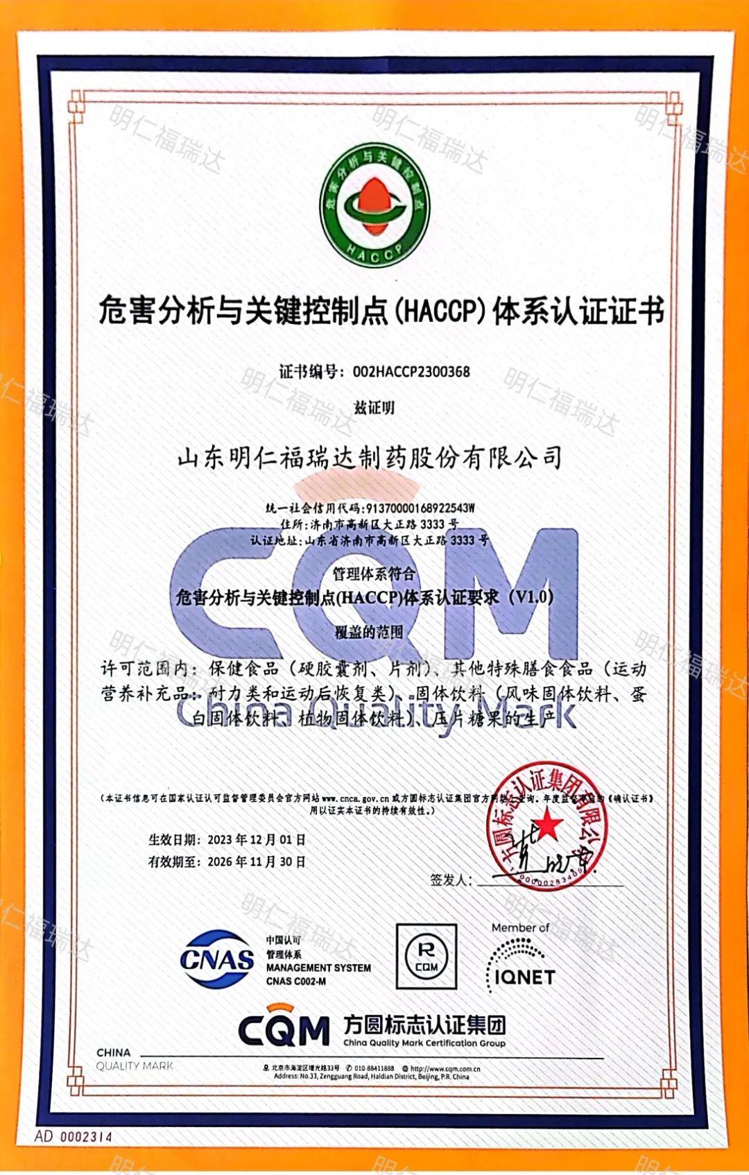 近日,明仁福瑞達順利通過食品安全管理體系和HACCP體系認證。
