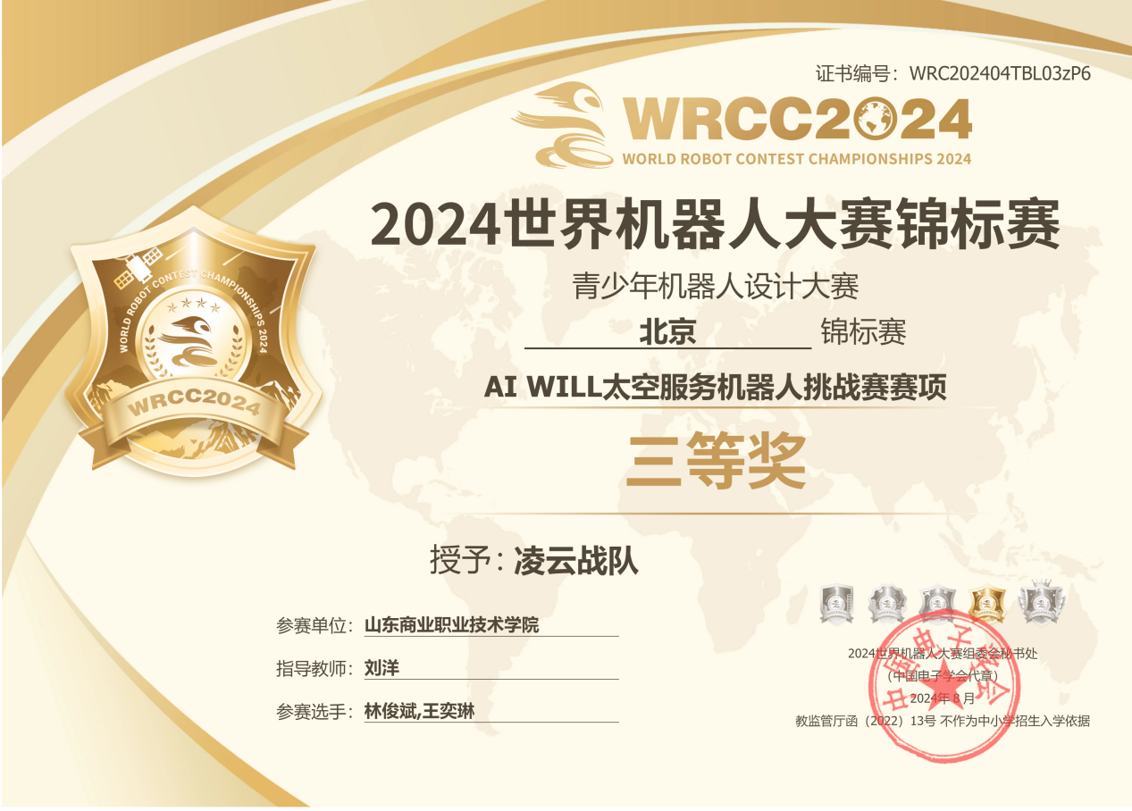 近日,2024世界機器人大賽北京錦標賽結(jié)束,山東商職學院選派的“凌云戰(zhàn)隊”在AI WILL太空服務(wù)機器人賽項中,喜獲三等獎。