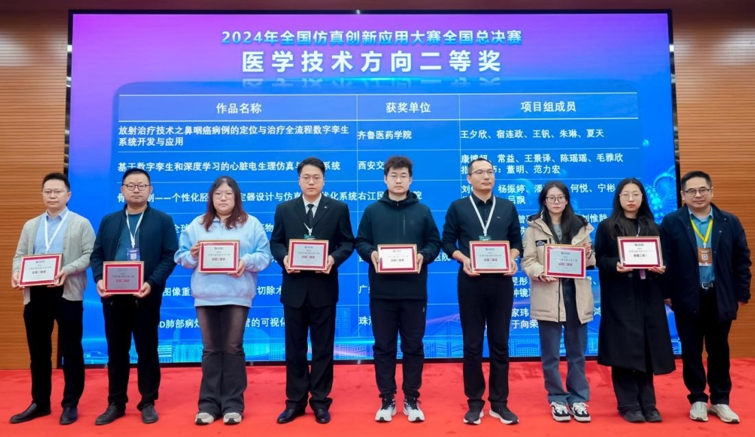 全國仿真創新應用大賽是我國仿真技術創新應用領域最高水平的技術競賽,本次大賽以“仿真驅動創新,應用推進融合”為主題,自2024年1月份啟動以來,吸引了全國眾多院校積極參與。齊魯醫藥學院高度重視,多輪次細致籌劃,對參賽學生進行有針對性地培訓,指導學生精心打磨作品,《放射治療技術之鼻咽癌病例的定位與治療全流程數字孿生系統開發與應用》和《PET-CT檢查技術虛擬仿真實驗系統》得到評委一致認可,均榮獲二等獎。