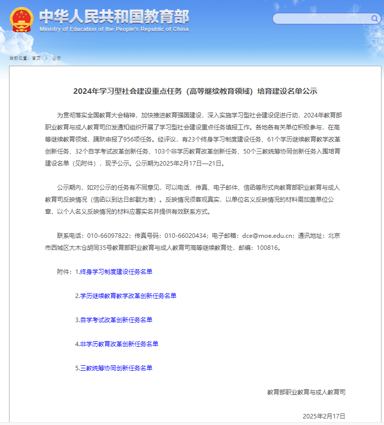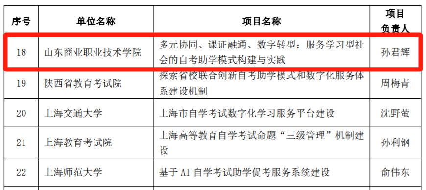 經(jīng)教育部專(zhuān)家評(píng)議,在高等繼續(xù)教育領(lǐng)域956項(xiàng)任務(wù)中,共評(píng)選出23個(gè)終身學(xué)習(xí)制度建設(shè)任務(wù)、61個(gè)學(xué)歷繼續(xù)教育教學(xué)改革創(chuàng)新任務(wù)、32個(gè)自學(xué)考試改革創(chuàng)新任務(wù)、103個(gè)非學(xué)歷教育改革創(chuàng)新任務(wù)、50個(gè)三教統(tǒng)籌協(xié)同創(chuàng)新任務(wù)入圍培育建設(shè)名單。山東商職學(xué)院憑借在服務(wù)區(qū)域?qū)W習(xí)型社會(huì)建設(shè)、推動(dòng)職業(yè)教育、高等教育與繼續(xù)教育融合發(fā)展方面的創(chuàng)新實(shí)踐與顯著成效,與眾多知名高校同時(shí)入選自學(xué)考試改革創(chuàng)新任務(wù)。該項(xiàng)目在山東省教育招生考試院指導(dǎo)下,聯(lián)合山東大學(xué)等主考院校,著力構(gòu)建協(xié)同創(chuàng)新機(jī)制、思政教育與技術(shù)教育融合機(jī)制、課程實(shí)踐考核置換機(jī)制和監(jiān)督保障機(jī)制,打造“一站式”學(xué)習(xí)服務(wù)平臺(tái),推動(dòng)高等教育自學(xué)考試的數(shù)字化轉(zhuǎn)型升級(jí)。