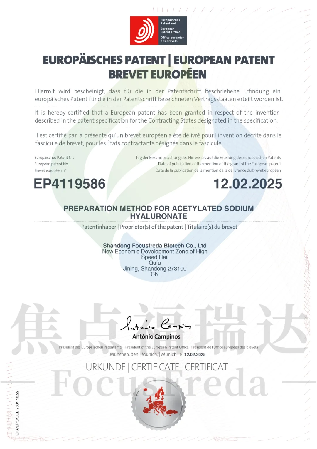 近日,焦點福瑞達再獲一項歐洲專利授權——《PREPARATION METHOD FOR ACETYLATED SODIUM HYALURONATE》(一種乙酰化透明質酸鈉的制備方法),這一專利不僅驗證了焦點福瑞達在透明質酸鈉衍生物研發領域的技術領先性,更標志著企業的技術創新能力再次獲得國際權威認可,為強化品牌影響力以及全球市場的進一步開拓提供關鍵技術保障。