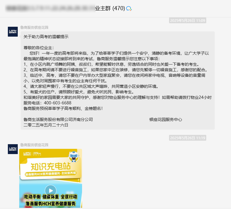 每一次輕聲細語的提醒,每一條溫暖人心的祝福,匯聚成的不僅是當下的靜音環境,更是鄰里守望相助、社區溫情脈動的力量。此次多城聯動的護考行動,是魯商服務“用心守護美好生活”理念的生動實踐。魯商服務將持續完善應急響應機制,優化符合業主需求的特色服務,并探索建立覆蓋更多生活場景的“溫情守護”預案,持續構筑更具人文關懷的幸福家園。