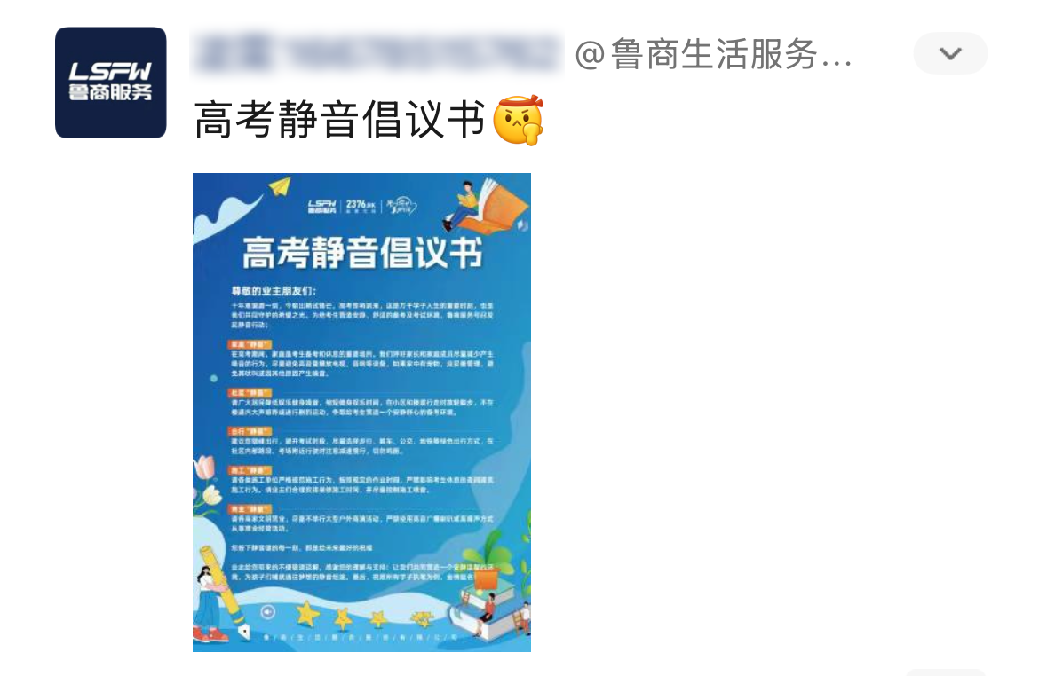 高考前夕,魯商服務濟南城市公司以“靜音”為核心,打造全周期護考體系。各小區通過“線上+線下”立體宣傳,在公告欄、電梯間等10余類場景發布靜音倡議,并創新建立“噪音管控責任網格”,由工作人員分區勸阻廣場舞、規范寵物管理,同步調整綠化修剪等作業時間。