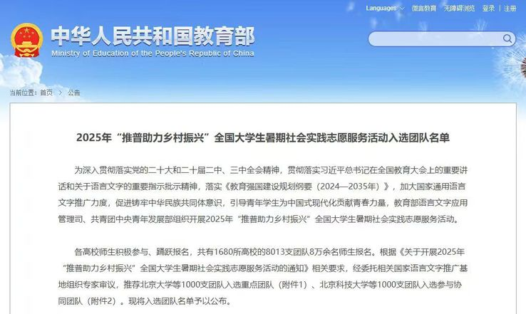 “百村計劃”推普助力鄉村振興志愿服務隊以“鄉約文旅新征程 推普筑夢促振興”為主題,聚焦鄉村語言文化與文旅產業融合發展,組建專業團隊,赴新疆喀什地區葉城縣開展系列推普實踐活動,以語言賦能鄉村振興?!扒嘌恪蓖破罩︵l村振興服務隊以“‘青雁’傳聲 語潤‘天等’”為主題,融合了漢族、壯族青年學生,聚焦廣西天等縣,以專業知識和青春熱忱精準賦能當地鄉村發展,探索符合地方特色的振興路徑,為廣西鄉村振興戰略貢獻智慧與力量。