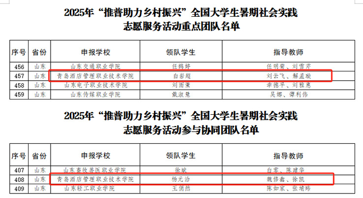 近日,教育部公布《2025年“推普助力鄉村振興”全國大學生暑期社會實踐志愿服務活動入選團隊名單》,青島酒店管理職院“百村計劃”推普助力鄉村振興志愿服務隊、“青雁”推普助力鄉村振興服務隊入選。入選團隊數量較往年繼續有所突破,位居山東省高職院校前列、青島市高職院校首位。